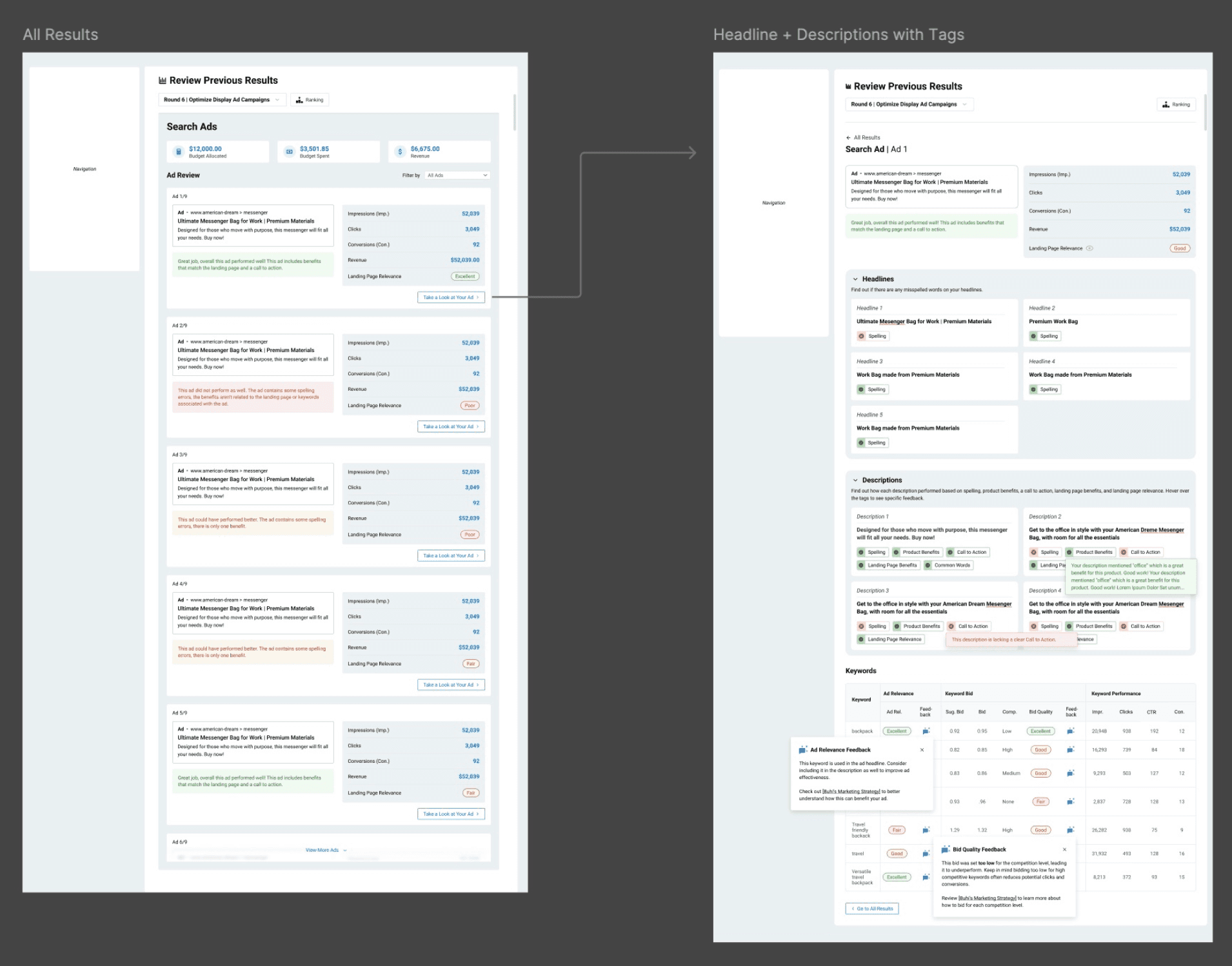 To validate the redesigned flow, I developed interactive prototypes that simulated how users would navigate between summary insights and deeper ad performance analysis.